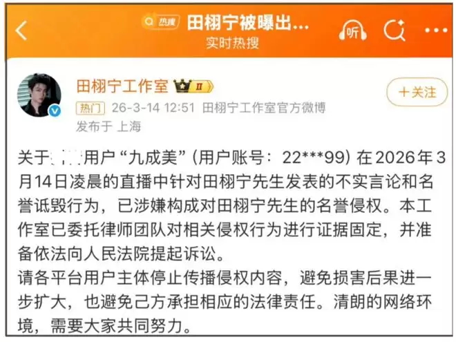 田曦宁出轨风波升级!工作室将起诉女网红亲密照传闻
