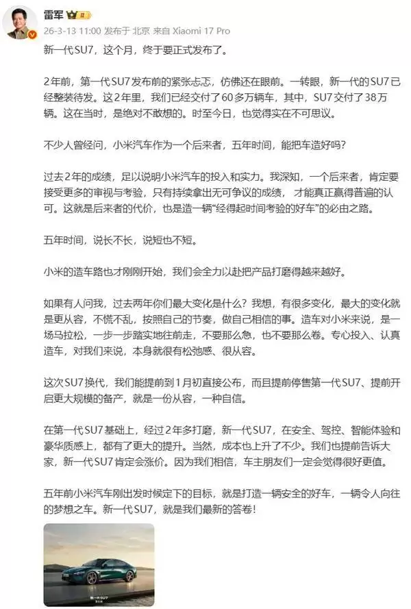 雷军表示,小米此次换代SU7的提前公布、第一代车型的停售以及大规模备产的启动,均体现了品牌对市场节奏的精准把控和充足信心。尽管新一代SU7在外观设计上延续了前代的经典风格,但在安全、驾控、智能体验和豪华质感等方面进行了全面升级,成本也随之增加,这是售价上调的主要原因。