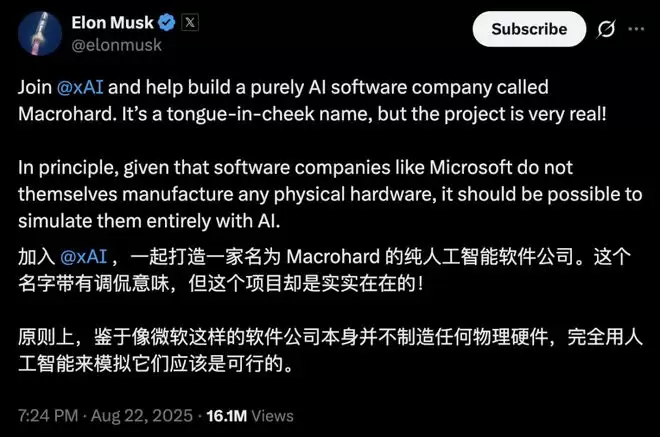 马斯克后来在X上表示,Macrohard项目被重新定义为xAI与特斯拉联合推进。