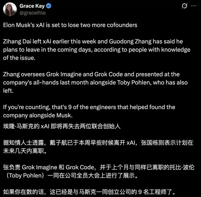 就在本周,传出了戴子航和张国栋离职xAI的消息。此前,已有3位xAI华人联合创始人相继离职。