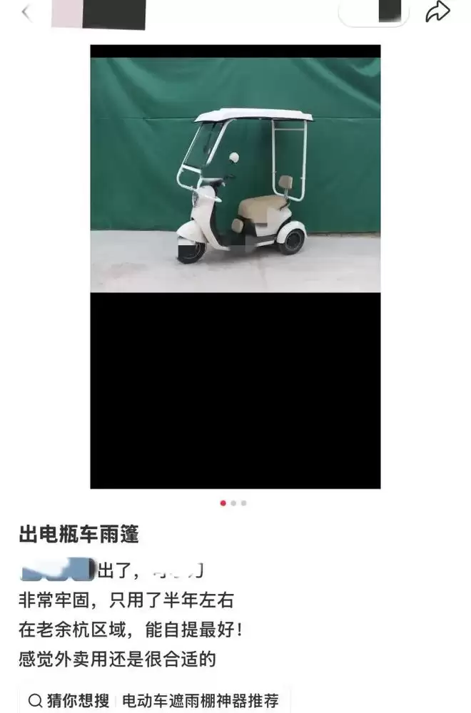 近日,杭州一位网友发帖说,非常牢固的电动车雨蓬,只用了半年,现在可以出售,最好能自提,感觉外卖用还是很合适。