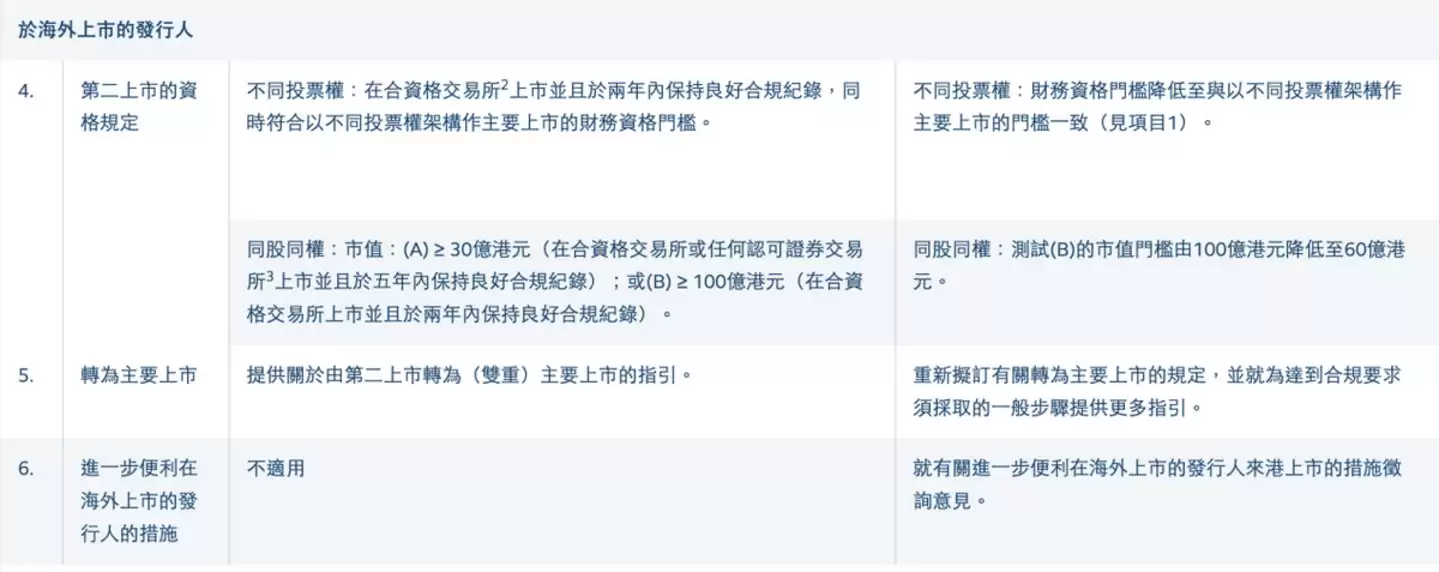 在核心资格要求上,不同投票权架构公司的财务资格门槛将直接与主要上市地对齐,不再额外设限;而同股同权公司的二次上市市值门槛更是大幅下调——原要求的100亿港元门槛直接降至60亿港元,让更多中大型海外上市企业具备了来港上市的条件。