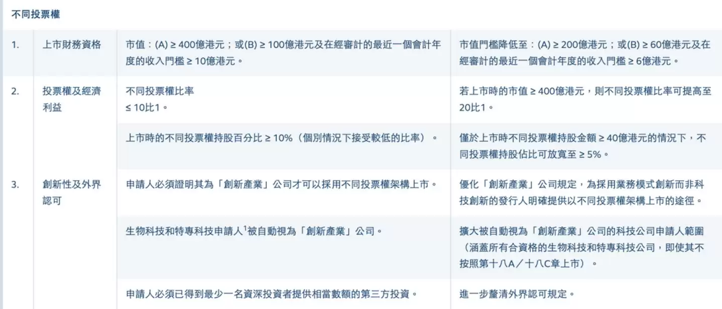 与此同时,若公司上市时市值达到400亿港元,WVR投票权比例上限可从10比1放宽至20比1。在特定条件下,WVR持股的最低经济利益要求也可由10%放宽至5%,前提是持股金额至少达到40亿港元。