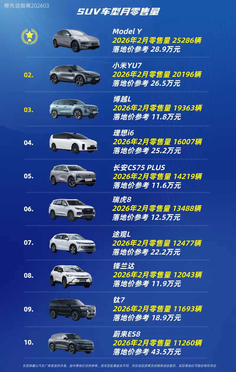 2026年2月SUV市场:Model Y强势回归领跑,月销再破2.5万辆