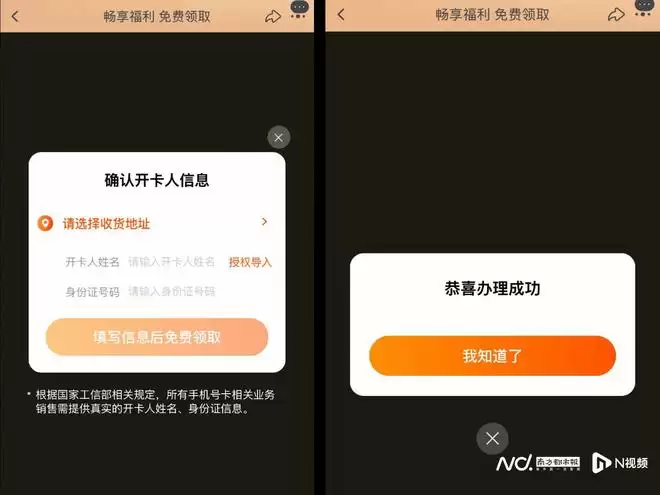 记者点击横幅后立即跳转添加个人信息页面,填写后便显示开卡成功,全程无任何资费规则提醒,且在流量卡收到后,开卡员也不了解卡片的资费信息。记者在最新APP 查询发现,该卡的资费为 39 元/月,与宣传内容不符。