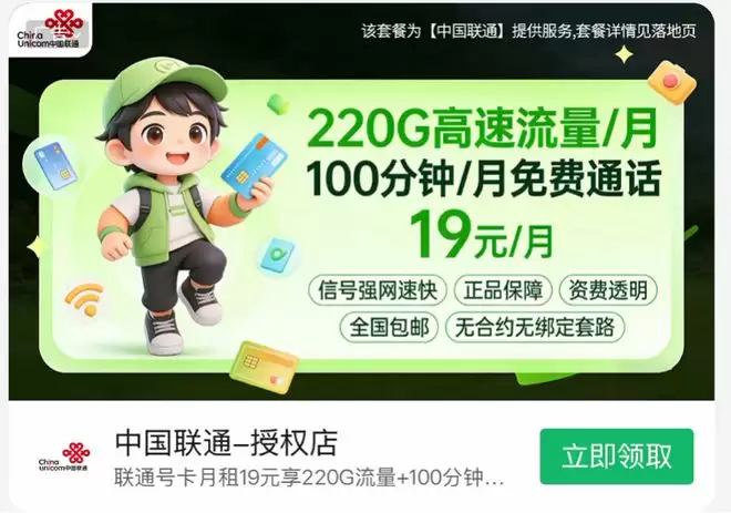 在另一网购平台,奥一新闻记者搜索“流量卡”,首页顶部便弹出大面积办理横幅,标注 “19 元月租 220G 全国流量”,对应的店铺为联通爱流量通信专卖店,店铺页面显著位置标注了运营商最新授权编码。