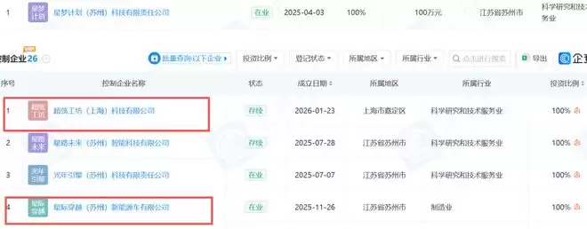 星际穿越(苏州)新能源车有限公司,星际穿越(苏州)新能源车有限公司成立于2025-11-26,法定代表人为林波,注册资本为100万元。星际穿越(苏州)是星梦计划(苏州)科技有限责任公司全资子公司,星梦计划(苏州)科技有限责任公司成立于2025-04-03,法定代表人为马俊野,注册资本为100万元。星梦计划(苏州)又是天空自由智能科技(苏州)有限公司的全资子公司,天空自由智能科技(苏州)有限公司成立于2025-06-18,法定代表人为秦浩然,注册资本为100万元。秦浩然同时又是追觅软件(苏州)有限公司、追觅美学科技(苏州)有限公司等公司的执行公司事务的董事。