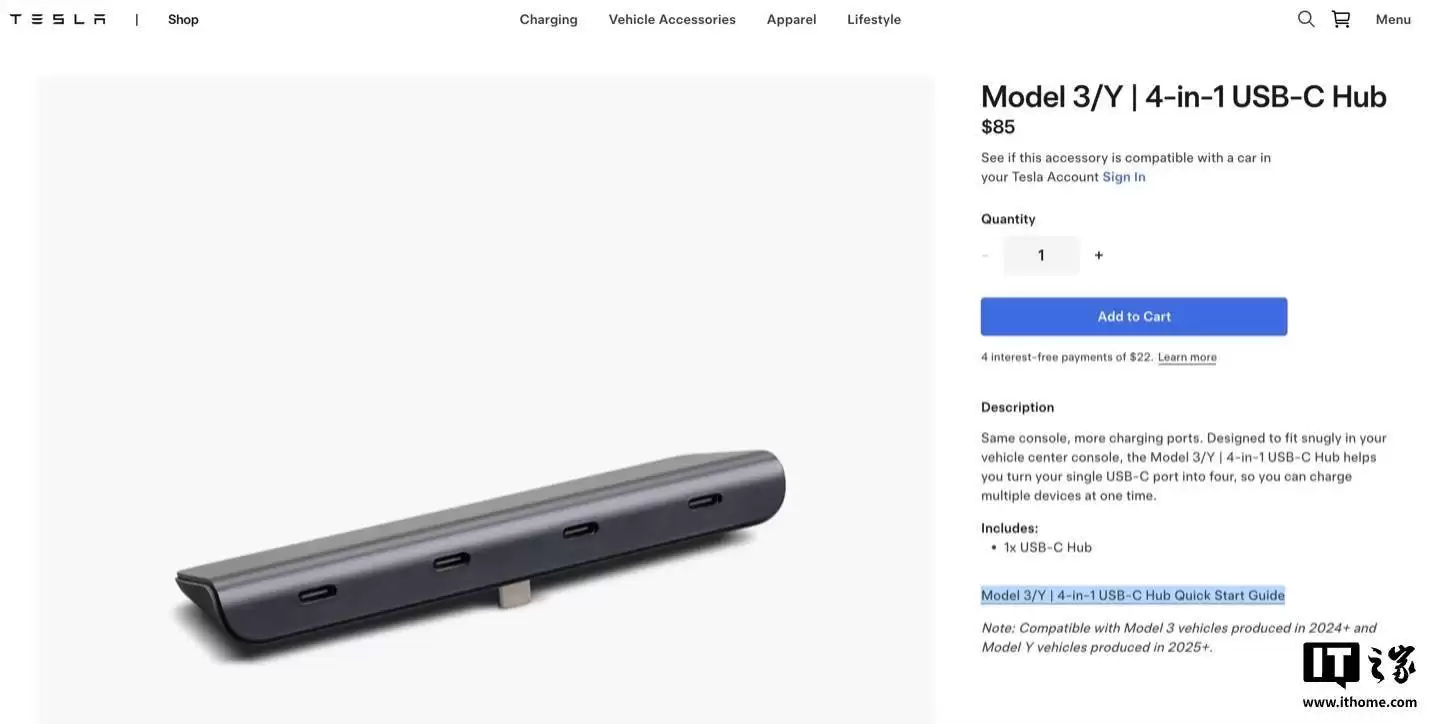 特斯拉4合1 USB-C集线器上线,适配新款Model 3与Model Y