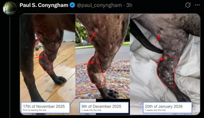 短短数周,Rosie在接受定制的mRNA 癌症疫苗治疗后,后腿关节上那个网球大小的肿瘤竟「缩小了一半」!