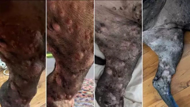 Paul还晒出了爱犬治疗前后,腿部的肿瘤从网球般大小,一天天见好的过程。