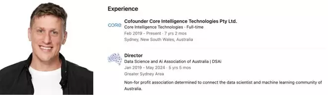 他曾联合创立Core Intelligence Technologies,并担任澳大利亚数据科学与AI协会的主管。