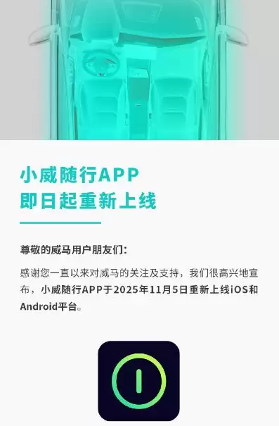 2025年11月,威马汽车在微博宣布:“好事将近,敬请期待。”随后最新APP“小威随行”上线,蓝牙车控、蓝牙钥匙、远程车控、车辆信息同步等功能恢复,但仅支持威马EX5、EX6车型。