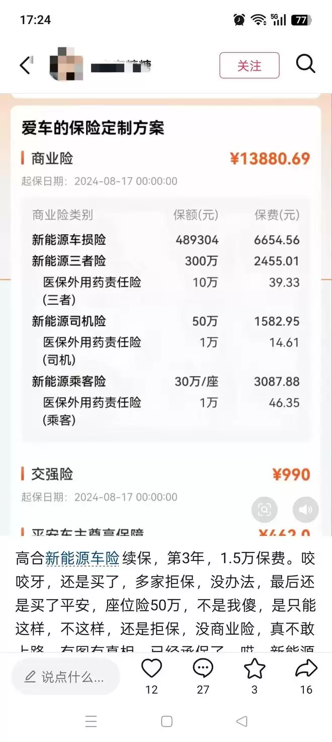 还有高合车主反映,自己遭到多家保险公司拒保,或是必须捆绑50万元的座位险。她晒出的保单显示,车价48.9万元,车损险为6654元。