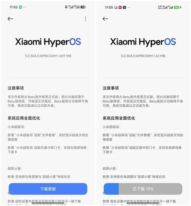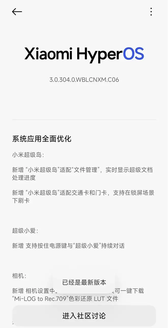然后就是最新中的一些更新日志,比如小米超级岛现在不仅能显示音乐播放器和倒计时,还适配了文件管理,下载文件时的进度可以直接在岛上看到。