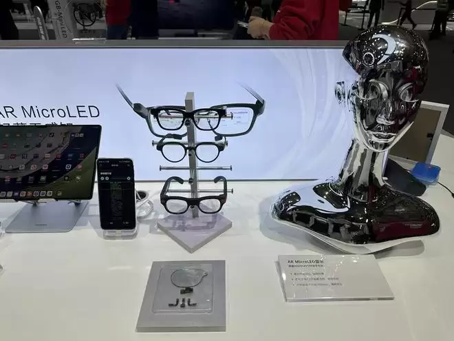 例如,海思此次在微屏区展台展示了Micro LED AR 显⽰芯⽚及由其技术支持的成品AR 眼镜。功耗⽅⾯,单绿⽅案理论上可以⽀持1.5天以上的佩戴时间,并保持6000nits的⼊眼亮度。