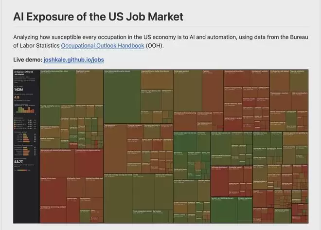 3月16日,就在人们日益担忧一场“就业灾难”可能席卷整体经济之际,安德烈·卡帕西 (Andrej Karpathy) 利用人工智能评估了哪些美国职业最容易受到这项技术的影响。