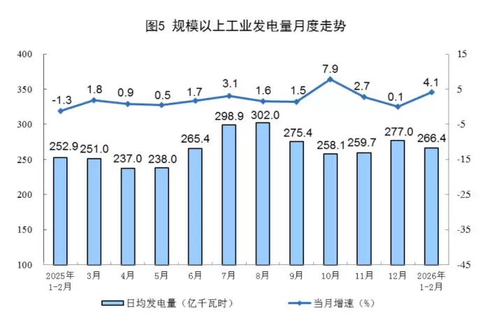 国家统计局3月16日发布数据显示,2026年1月至2月,全国规模以上工业发电量达到15718亿千瓦时,同比增长4.1%。与2025年12月相比,增速加快了4.0个百分点;日均发电量约为266.4亿千瓦时。