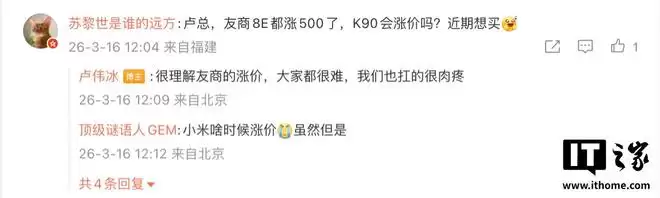 卢伟冰回应Redmi K90是否涨价:理解成本压力,坦言定价很纠结