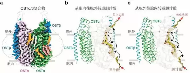 结构图清晰显示,在OSTα/β蛋白内部,存在一个专门用于“抓取”胆汁酸的“口袋”。这个口袋内带有正电荷的氨基酸残基,恰好能与带负电的胆汁酸分子头部相互吸引,就像磁铁的正负两极,确保了OSTα/β蛋白和胆汁酸结合的特异性和高效性。
