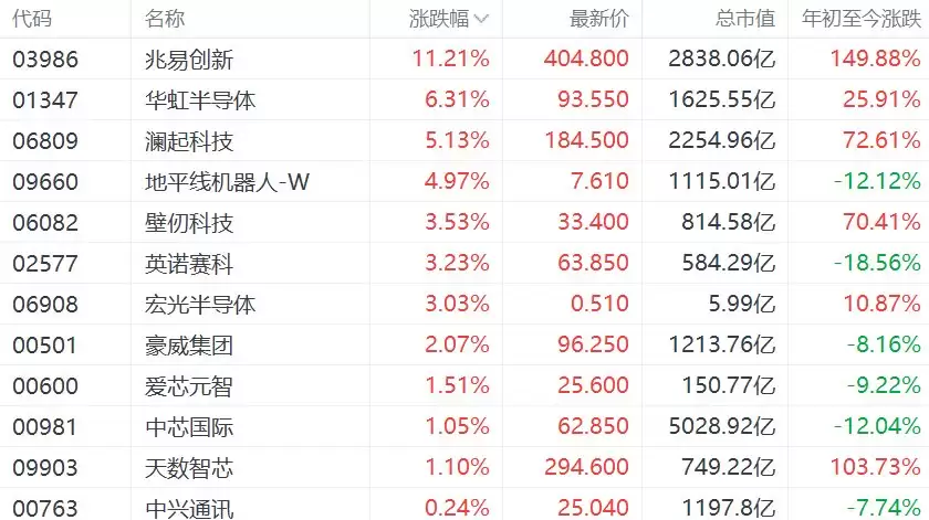 港股芯片股拉升:兆易创新涨超11%,华虹半导体涨6%