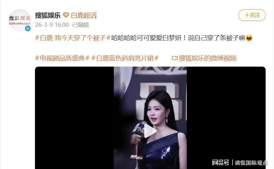 3月9日,在电视剧品质盛典的红毯上,白鹿一句“我今天穿了个被子”的幽默自嘲瞬间引爆了网络,风头甚至盖过了她身上那件货真价实的法国高定礼服。当其他明星还在努力诠释“高级感”时,白鹿已经用最接地气的比喻,把自己和热搜第一牢牢“裹”在了一起。