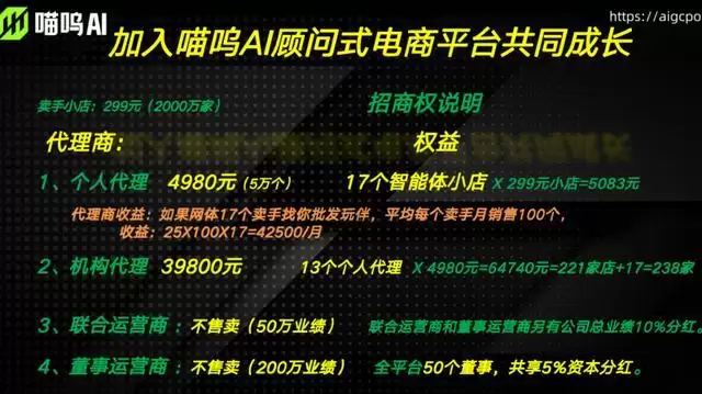 智能体店铺的运营者被称为“卖手”,卖手有两种方式可以获得喵呜AI的智能体店铺:一是最少缴纳4980元成为代理商并获得一定数量的智能体店铺;二是以299元一个的价格从代理商手中购买智能体店铺。