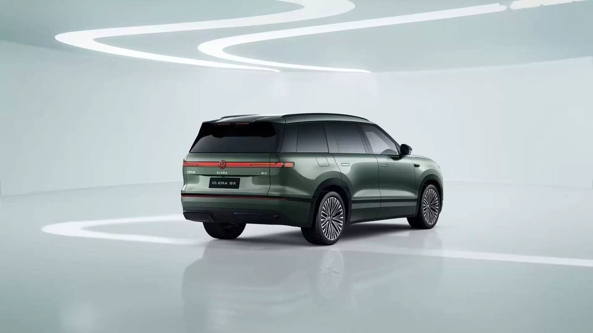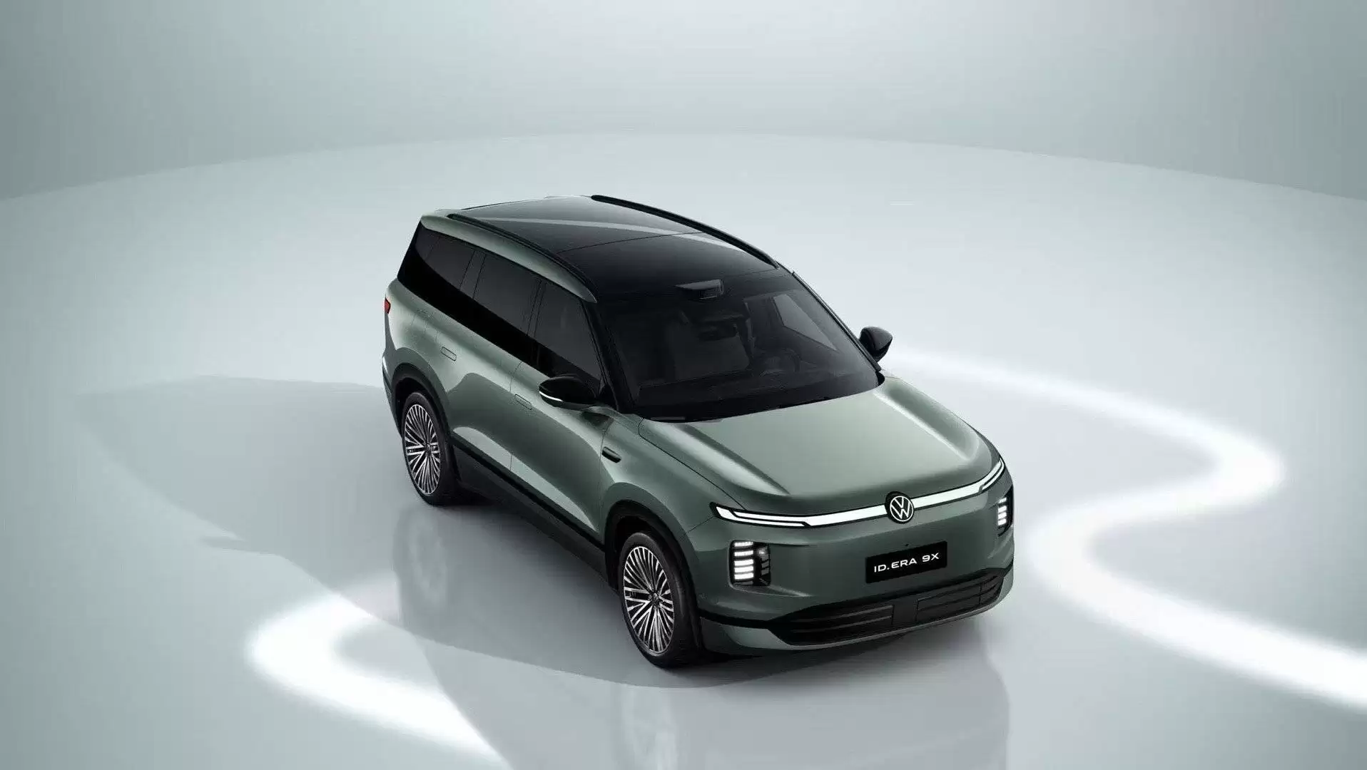 ID. ERA 9X在外观设计上展现了强烈的未来主义风格。车身尺寸达到5207mm×1997mm×1810mm,轴距为3070mm,营造出宽敞舒适的乘坐空间。车头采用贯穿式LED灯带设计,搭配可发光品牌标识,两侧配备矩形LED日间行车灯,形成独特的视觉辨识特征。整车线条流畅自然,配合隐藏式门把手与低风阻轮毂设计,进一步强化了科技美感。