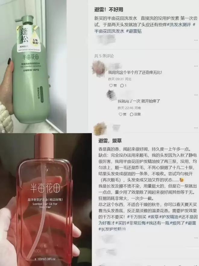 在小红书上,关于半亩花田的“避雷”帖也不少,“我买的半亩花田身体乳难闻得像坏了一样,没过期但挤出来像水渣一样。”“本来出一身汗。高兴兴回家洗个澡,结果洗完涂个身体乳又变得非常黏腻”“新买的半亩花田蓬松控油洗发水,两天头发就油了,而且头皮还发痒,不好用”。