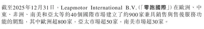在出海方面,截至2025年12月31日,Leapmotor International B.V.(“零跑国际”)在欧洲、中东、非洲、南美和亚太等约40个国际市场建立了约900家兼具销售与售后服务功能的网点,其中欧洲超800家,亚太市场超50家,南美市场超30家。