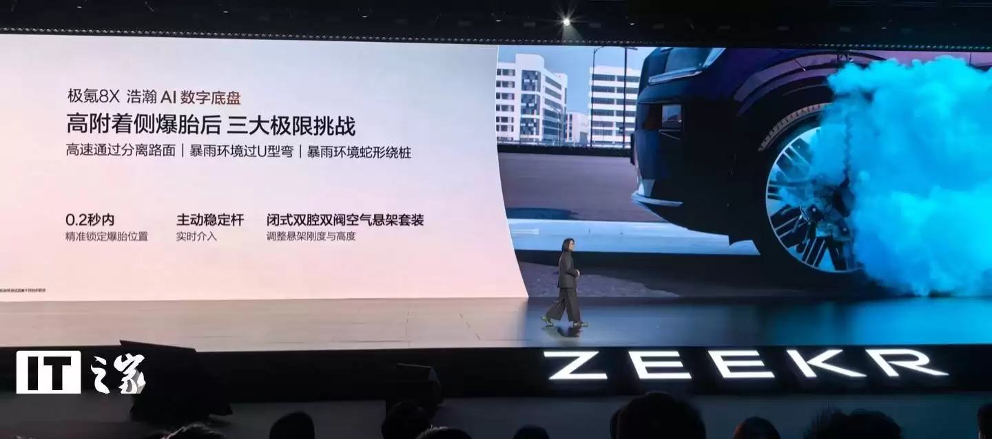 在热管理系统上,极氪8X行业首创了十源热泵系统和九通阀技术,实现了全车热能的高效循环利用。同时,车辆配备了双核随速AGS主动格栅,进一步优化了空气动力学表现。底盘方面,浩瀚AI数字底盘带来了超级硬件主动稳定杆,具备0.2秒瞬态响应和高达1400牛·米的平衡扭矩,在麋鹿测试中,其干路面通过速度达到了83.6公里/小时,湿滑路面则为76.3公里/小时。得益于闭环式双腔空气悬架与双阀CDC电磁减振器的组合,使车辆最大离地间隙达到241毫米,调节范围覆盖-30至50毫米,提供了出色的通过性与舒适性。