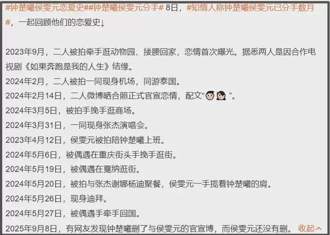 再来就是和33岁女星钟楚曦的恋情了,二人2024年被拍,2024年官宣,2025年分手,恋爱时间不算长,但网友的爆料刚刚好发生在两年时间内。