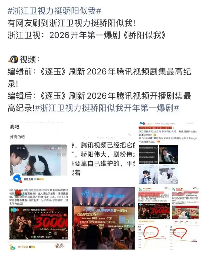 要知道,就在两个月以前(1月4日),《骄阳似我》刚刚以30130的站内热度刷新腾讯视频纪录,被最新认定为“2026开年第一爆款”。而随着《逐玉》热度持续走高,3月12日,腾讯视频将战报措辞悄悄从“刷新2026年剧集最高纪录”调整为“刷新2026年开播剧集最高纪录”,默认2025年年末播出的《骄阳似我》不计入榜单。这场关于“开播时间”的界定,让“年度剧集”的归属更加微妙。