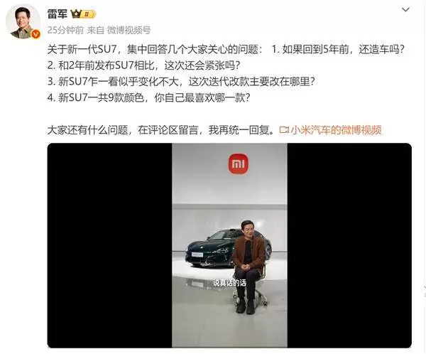 在新能源汽车市场竞争日趋白热化的背景下,小米汽车即将推出新一代SU7车型。这款被视作品牌核心产品的重要迭代,将于本月19日正式亮相。面对外界对新车型改动的关注,小米创始人雷军坦言,此次升级既满载期待也伴随压力,毕竟这是SU7首次进行全面的技术革新。