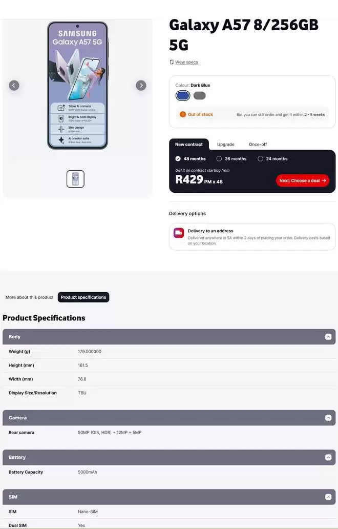 此前曝光信息显示,三星Galaxy A57机身尺寸为161.5x76.8x6.9mm,相比前代A56的7.4mm厚度更为纤薄,重量也从198克降至179克。该机型将搭载6.7英寸2340x1080分辨率120Hz刷新率屏幕,配备5000万像素主摄、1200万像素超广角及500万像素微距镜头。