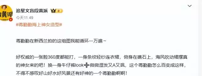 一身条纹轻纱连衣裙靠在礁石上,海风掀起裙摆吹乱发丝,清冷又温柔,连每根发丝都带着氛围感,随手一截都能直接当手机壁纸。转头换了利落的牛仔裤,湿发贴在脸颊,眉眼间全是随性的酷感,又新西兰的山海本来就像画一样,可在蒋勤勤面前,再好的风景都成了陪衬,美人自带的光芒根本藏不住。这种不刻意的松弛感,比多少磨皮到失真的精修大片都更打动人。生图里的她皮肤紧致五官精致,只是比年轻时多了几分岁月沉淀的韵味,这种由内而外的美,在浮躁的娱乐圈真的太难得。