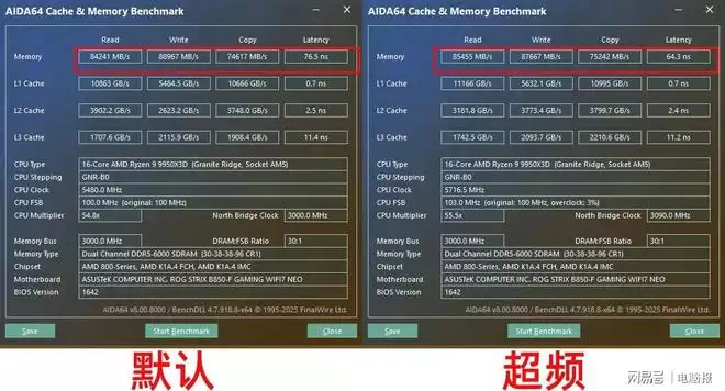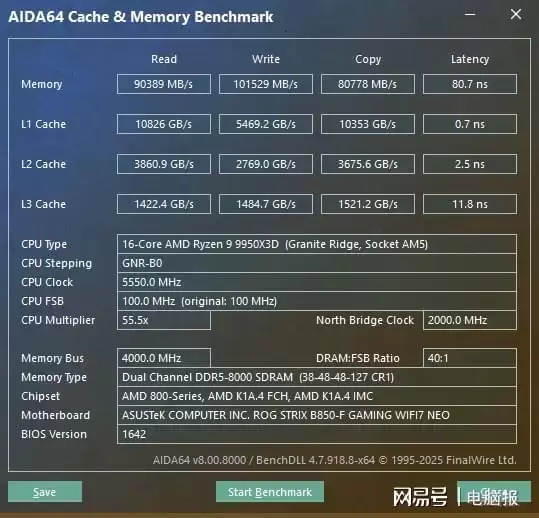内存性能测试部分,我们将DDR5 6000内存换成了DDR5 8000内存。在BIOS中开启EXPO功能,内存就能自动将频率提升到8000MT/s。此时内存读取速度为90389MB/s,写入速度为101529MB/s,延迟80.7ns,这个读写性能表现对AMD平台来说是非常优秀的,说明ROG STRIX B850-F GAMING WIFI7 NEO可以轻松满足高频内存对信号稳定性的需求,玩家也可以用来搭配低时序内存来提升电竞游戏的表现。