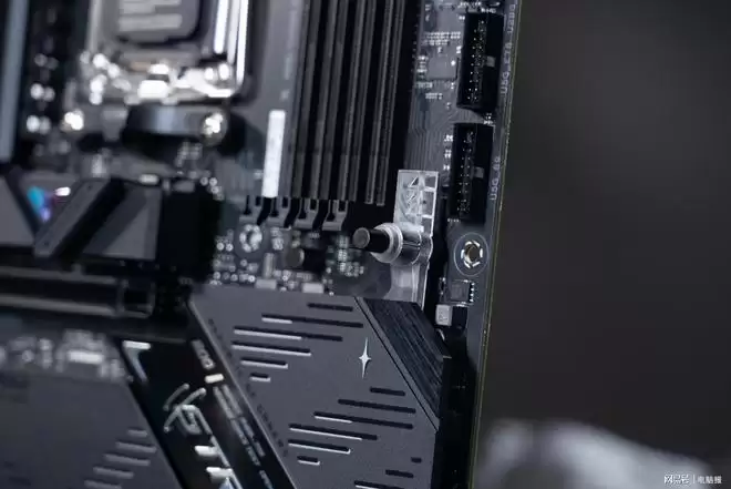 ROG STRIX B850-F GAMING WiFi7 NEO的外观设计保持了老款B850-F主板酷黑硬朗的赛博朋克风格,不过在细节上有所调整。主板整体采用了经典的全黑涂装,拥有ROG STRIX标志性的斜切风格设计,VRM散热装甲和PCH散热片部分新增了金属质感强烈的装饰片,表面的斜切暗纹会随视角变化而产生渐变闪烁的独特效果。同时,“大眼睛”RGB LOGO融入赛博朋克像素风设计,既有信仰又有颜值。