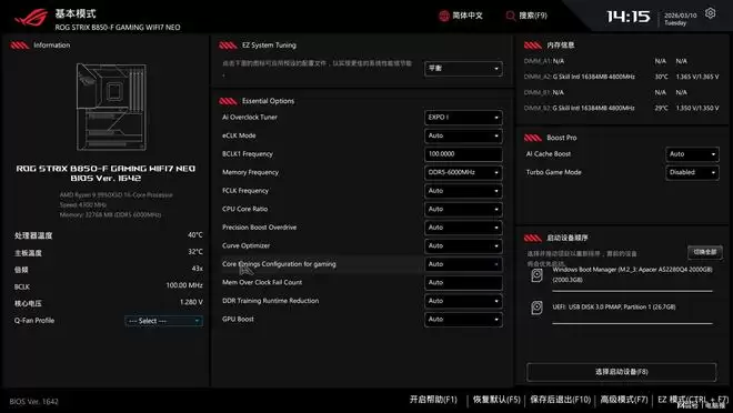 ROG STRIX B850-F GAMING WIFI7 NEO采用了最新的BIOS,新版BIOS的UI更有设计感和战斗感,支持1080P分辨率。新增的Essential超频控制为PC DIY新手提供简单易用的配置选项,高级模式下也为经验丰富的老手提供全面的调节功能。
