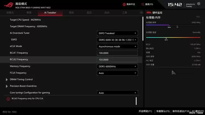 和之前的TUF GAMING X870-PRO NEO一样,ROG STRIX B850-F GAMING WIFI7 NEO也内置了异步时钟发生器,支持外频超频。具体的超频方式是在Ai Overclock Tuner开启Manusl选项后,就能在eCLK Mode(外频模式)中解锁同步或者异步模式,选择Asynchronous异步模式后多出的BCLK 2选项,就可以单独对处理器的外频进行调节了。