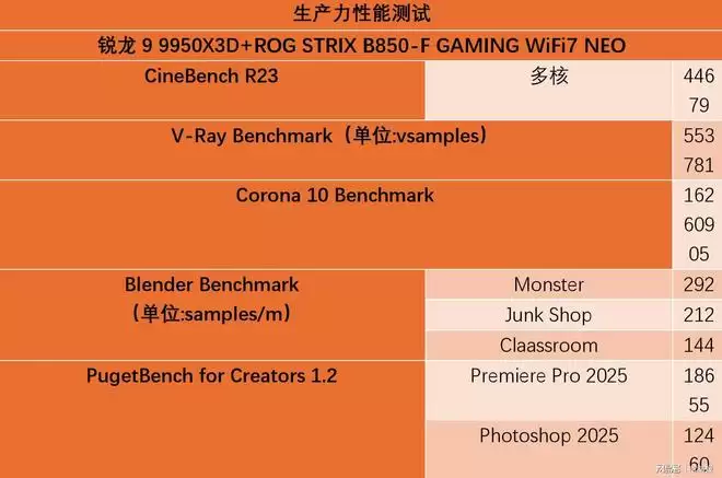 处理器生产力性能测试中,锐龙9 9950X3D处理器在Cinebench R23中的跑分达到了44679分。而在考验多线程性能的3D渲染软件中,也获得了出色的成绩。ROG STRIX B850-F GAMING WIFI7 NEO凭借豪华的供电、散热配置,在考验处理器性能的生产力测试中,其表现达到了高端X870主板的水平。