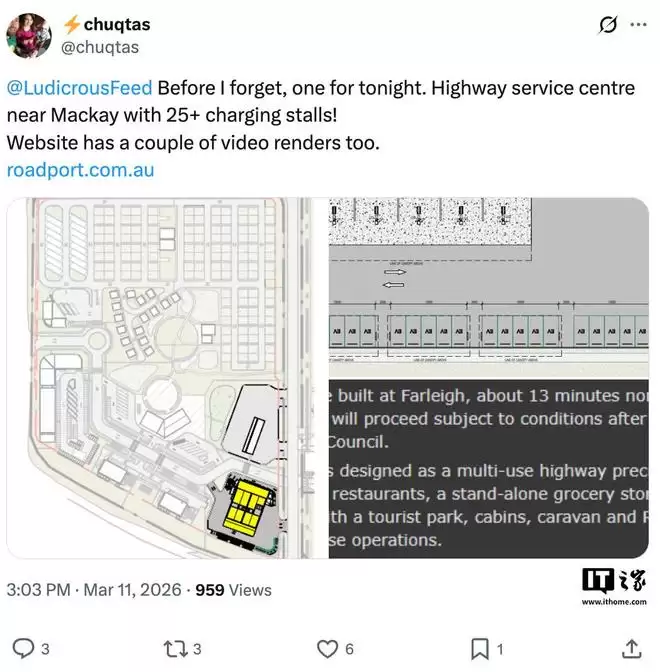 IT之家3月17日消息,据外媒Teslarati报道,特斯拉正计划在澳大利亚兴建一座大型超级充电站。该充电站竣工后将超越目前位于新南威尔士州的Goulburn充电站(设有20个充电车位),成为特斯拉在澳大利亚规模最大的充电站点。