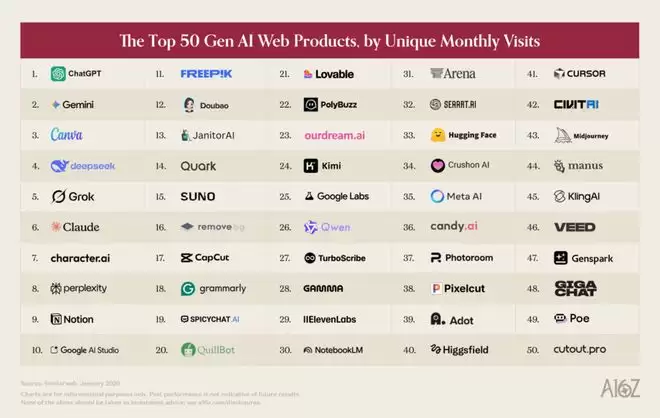 相比之下,硅谷顶尖风投机构安德森·霍洛维茨基金(a16z)发布的AI应用百强榜,被业内视为观察全球AI应用格局的最关键风向标。