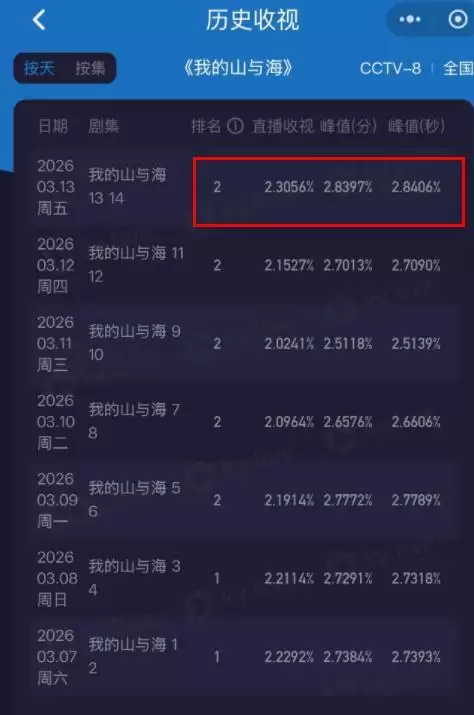 《逐玉》在网络上热播,《我的山与海》属于上星剧,从第一集到第十四集,这部剧的平均收视率为2.1730%,峰值2.8406%,从这点上看,成绩是非常亮眼的。