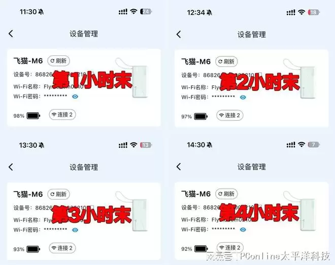 第1小时:飞猫M6随身WiFi剩余电量98%,机身表面温度正常。
