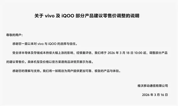 继OPPO、一加之后,国产手机品牌vivo与iQOO官宣部分产品建议零售价调整。3月16日,vivo在最新社区发布公告称,受全球半导体及存储成本持续大幅上涨的影响,经慎重评估,公司将于2026年3月18日10:00 起,调整部分产品的建议零售价。具体机型及价格以最新渠道商品详情页展示为准。3月10日,OPPO宣布因高速存储硬件在内的多项手机关键零部件成本上升,自3月16日起对部分已发售产品进行价格调整。目前涉及价格调整的已发售产品包括OPPO A系列、K系列以及一加。
