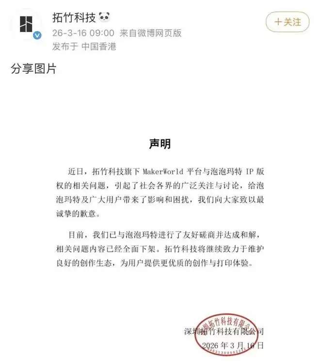 3月16日,拓竹科技最新微博发布公告,就旗下MakerWorld平台涉及泡泡玛特IP版权问题引发广泛关注一事正式致歉。