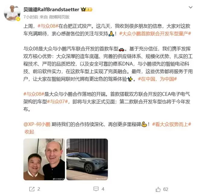 3 月 16 日消息,16日,大众汽车集团(中国)董事长兼首席执行官贝瑞德发文表示,上周,与众 08 在合肥正式投产。这是大众与小鹏合作落地的开端,首款搭载双方联合开发的 CEA 电子电气架构的车型与众 07,即将与大家正式见面;第二款联合开发车型也将于今年发布。