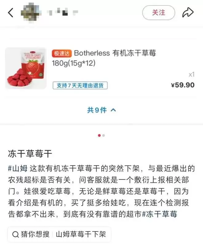 针对此事,当日,山姆最新客服回应媒体称,“目前您反馈的情况我将会反馈至相关部门。”据了解,目前山姆该产品已下架。此前报道,今年1月,福建漳州泰湖谷场食品有限公司负责人林女士自曝,公司出产的加糖冻干草莓重金属镉严重超标,还检测出20多种超范围使用的农药残留。