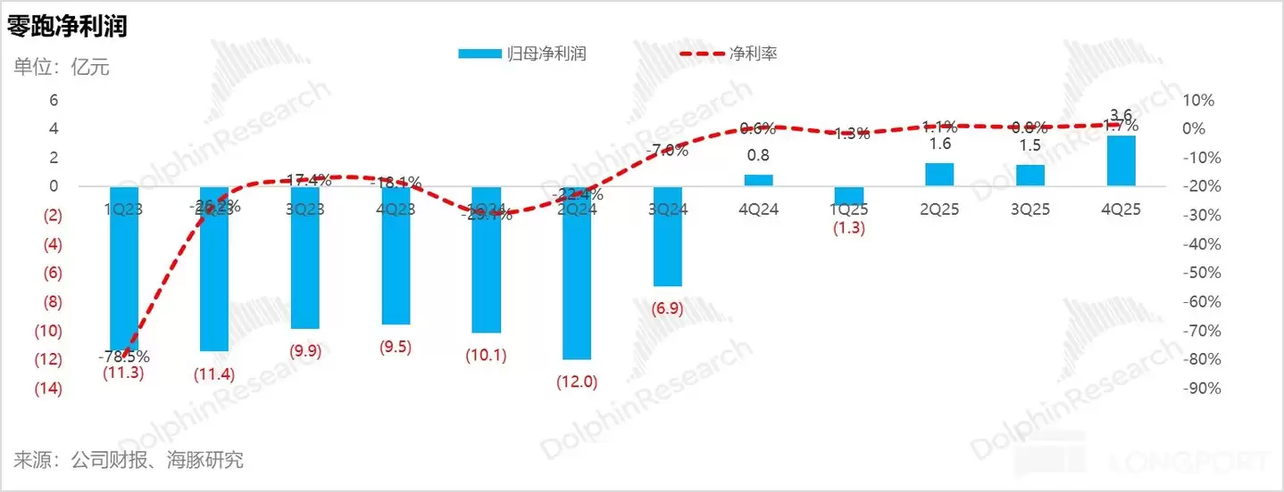 而本季度实际零跑的毛利率 15%,环比略有上行 0.5 个百分点,略高于管理层指引,主要仍然因为公司持续的强降本能力,以及四季度由于出海销量的高增,带来的高毛利的碳积分收入的确认也在增加(Q4 预计 5 亿 + VS Q3 2.5 亿)。