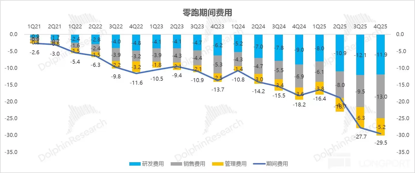 零跑四季度销售费用达 13.0 亿元,不仅大幅超出市场普遍预期的 10.3 亿元,环比第三季度也显著增加 3.5 亿元。费用的超预期增长,主要源于公司为支撑 2026 年激进的全球销量目标,而同步进行的国内渠道下沉扩张、海外网络布局以及品牌营销投入。